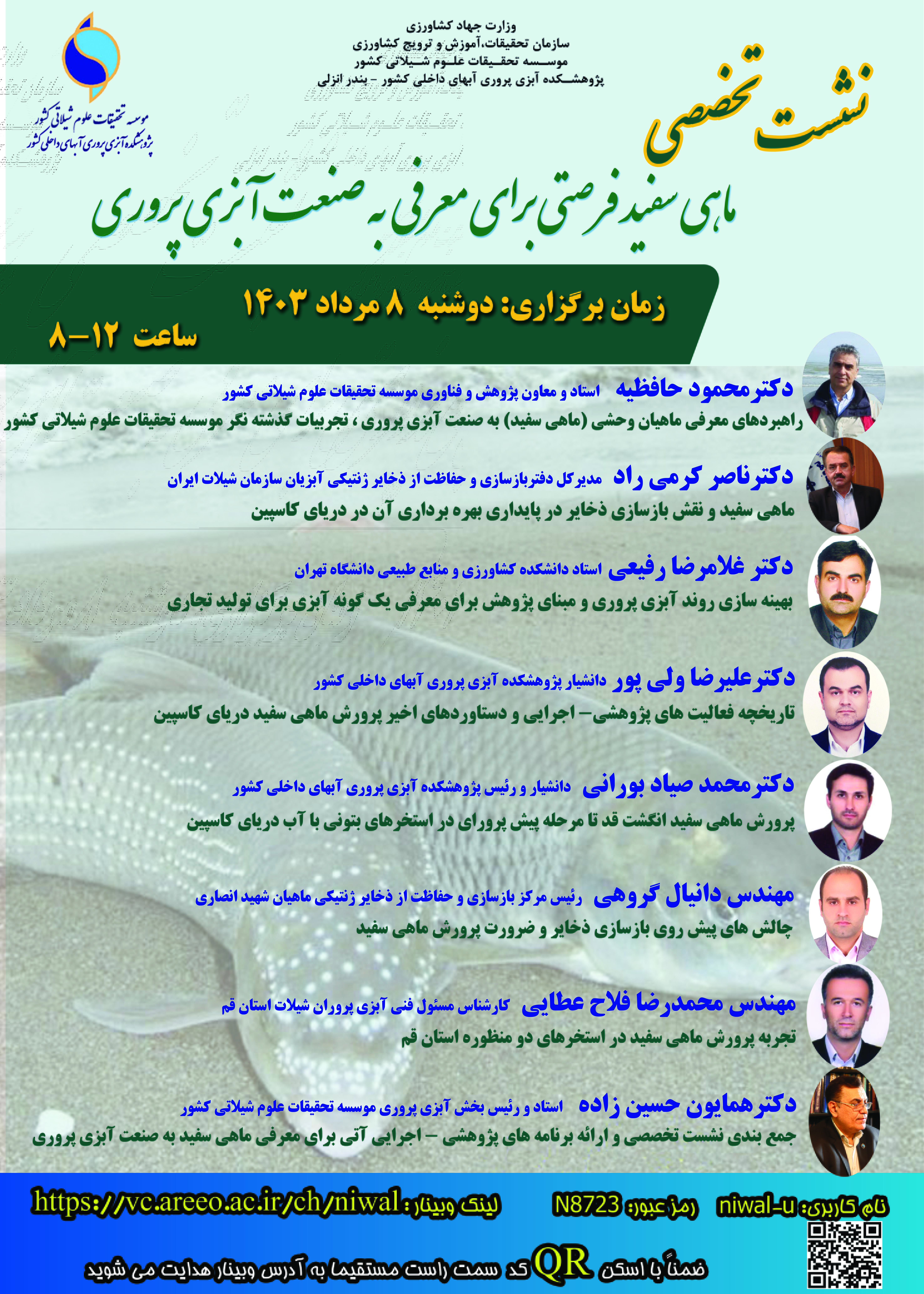 برگزاری نشست ماهی سفید فرصتی برای معرفی به صنعت آبزی پروری نشست تخصصی " ماهی سفید فرصتی برای معرفی به صنعت آبزی پروری" در مورخ 1403/5/8 از ساعت 8 الی 12 به صورت مجازی در این پژوهشکده برگزار می گردد. 1403/5/1 (130) (0) برگزاری نشست ماهی سفید فرصتی برای معرفی به صنعت آبزی پروری نشست تخصصی " ماهی سفید فرصتی برای معرفی به صنعت آبزی پروری" در مورخ 1403/5/8 از ساعت 8 الی 12 به صورت مجازی در این پژوهشکده برگزار می گردد. لینک ورود به وبینار : https://vc.areeo.ac.ir/ch/niwal نام کاربری: u-niwal رمز ورود : N8723